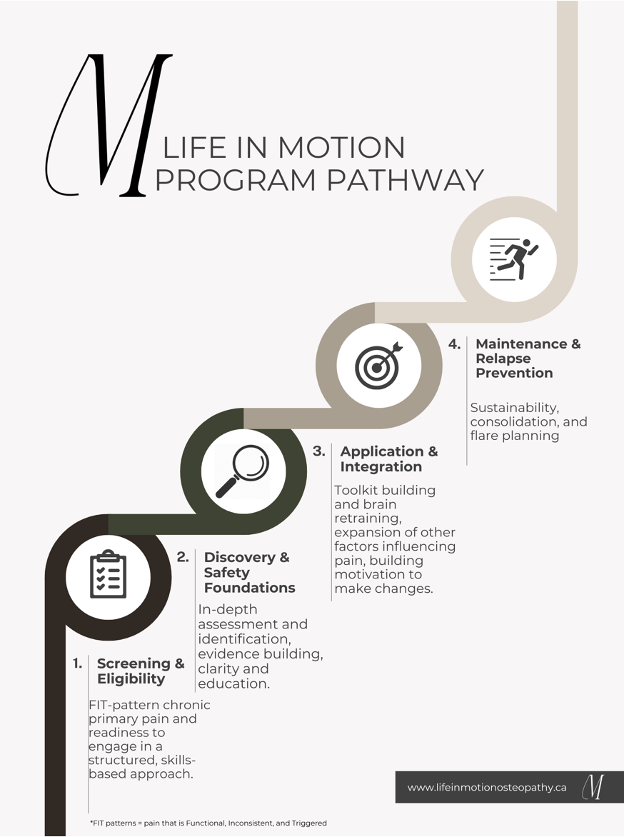 Participation in the Life in Motion Program begins with a structured screening process to confirm clinical suitability. Eligibility is determined through assessment of symptom history, presentation patterns, and FIT features (Functional, Inconsistent, Triggered pain patterns) associated with chronic primary pain.